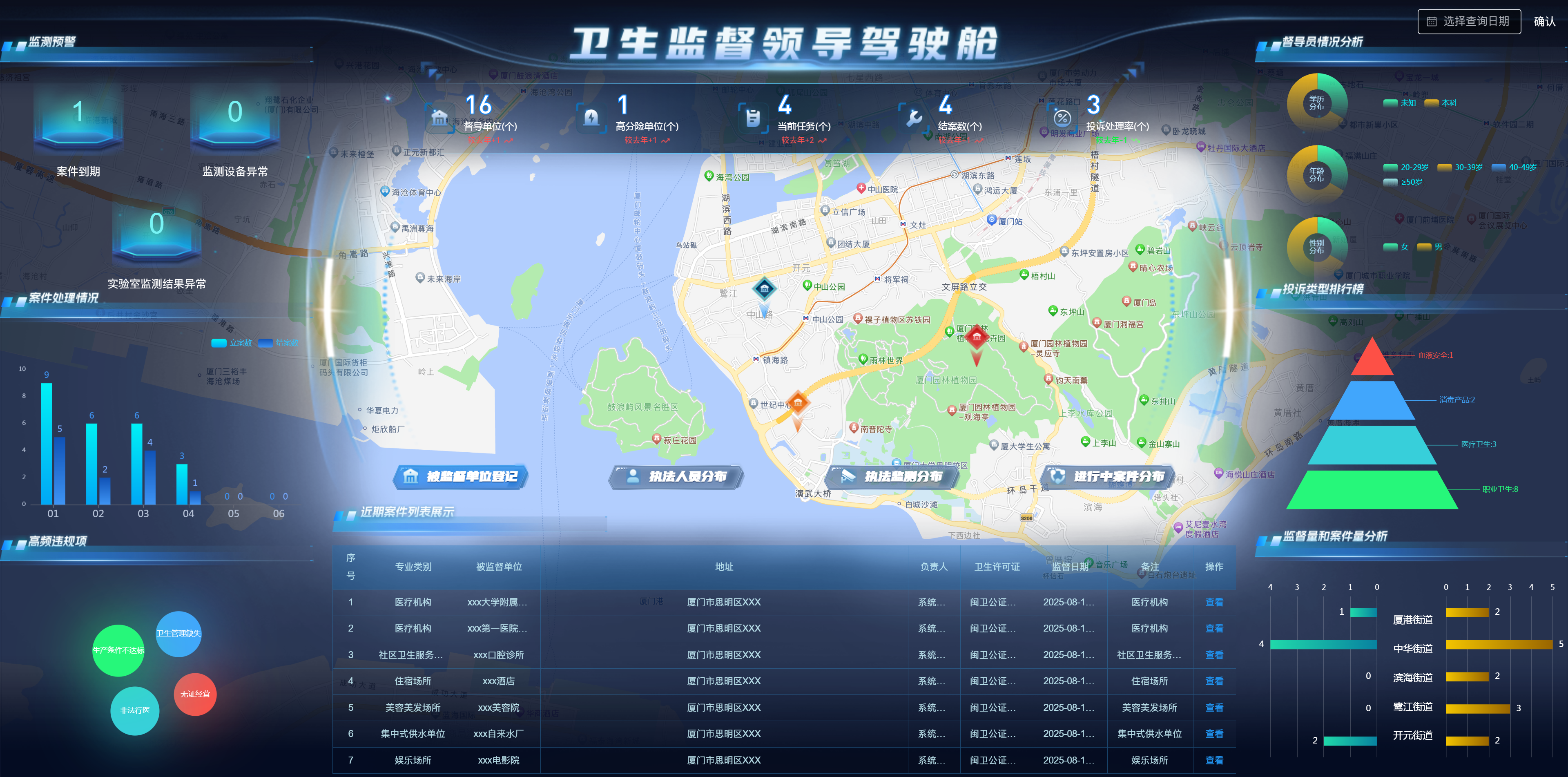 “智慧衛監綜合監管服務管理系統”涵蓋監督執法應用、非現場執法應用、碼上監管、可視化駕駛艙、信息交換系統等內容,實現加強衛生監督綜合執法能力建設,依法推進衛生監督工作,不斷創新衛生監督執法手段,提高衛生監督的監管和應急處置水平,通過建設智慧衛監系統,將傳統現場監管與非現場物聯網智能監督監測手段相結合,解決目前衛生監督機構無法及時掌握和處置突發狀況的問題,做到在第一時間獲取現場數據,在事件發生、升級前提前預警和處置,提高執法效率。